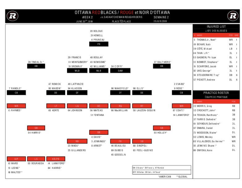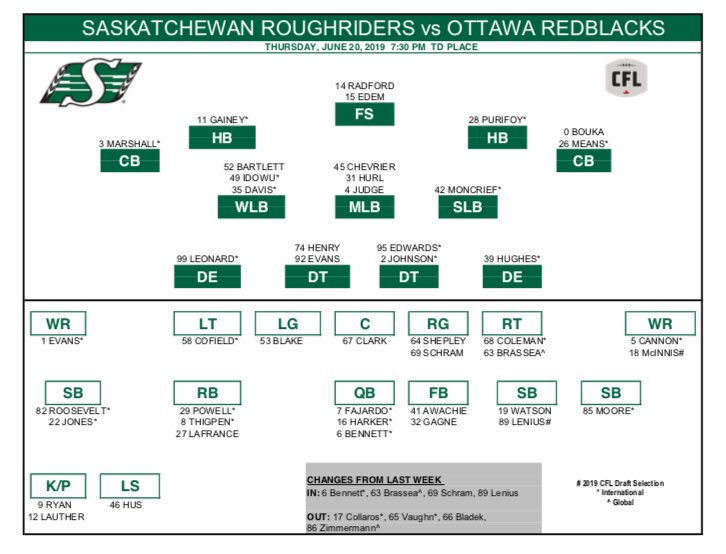 - Saskatchewan is still without starting left guard Brendon Labatte and now right guard Dariusz Bladek will miss Week 2. Dakoda Shepley steps in at right guard.